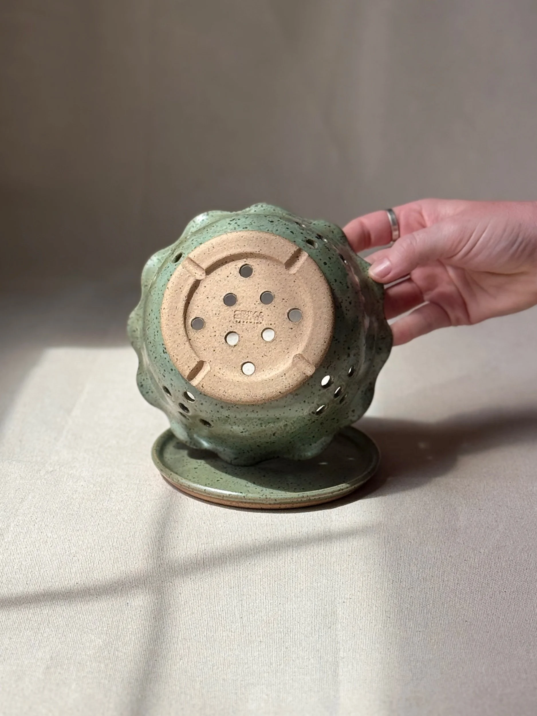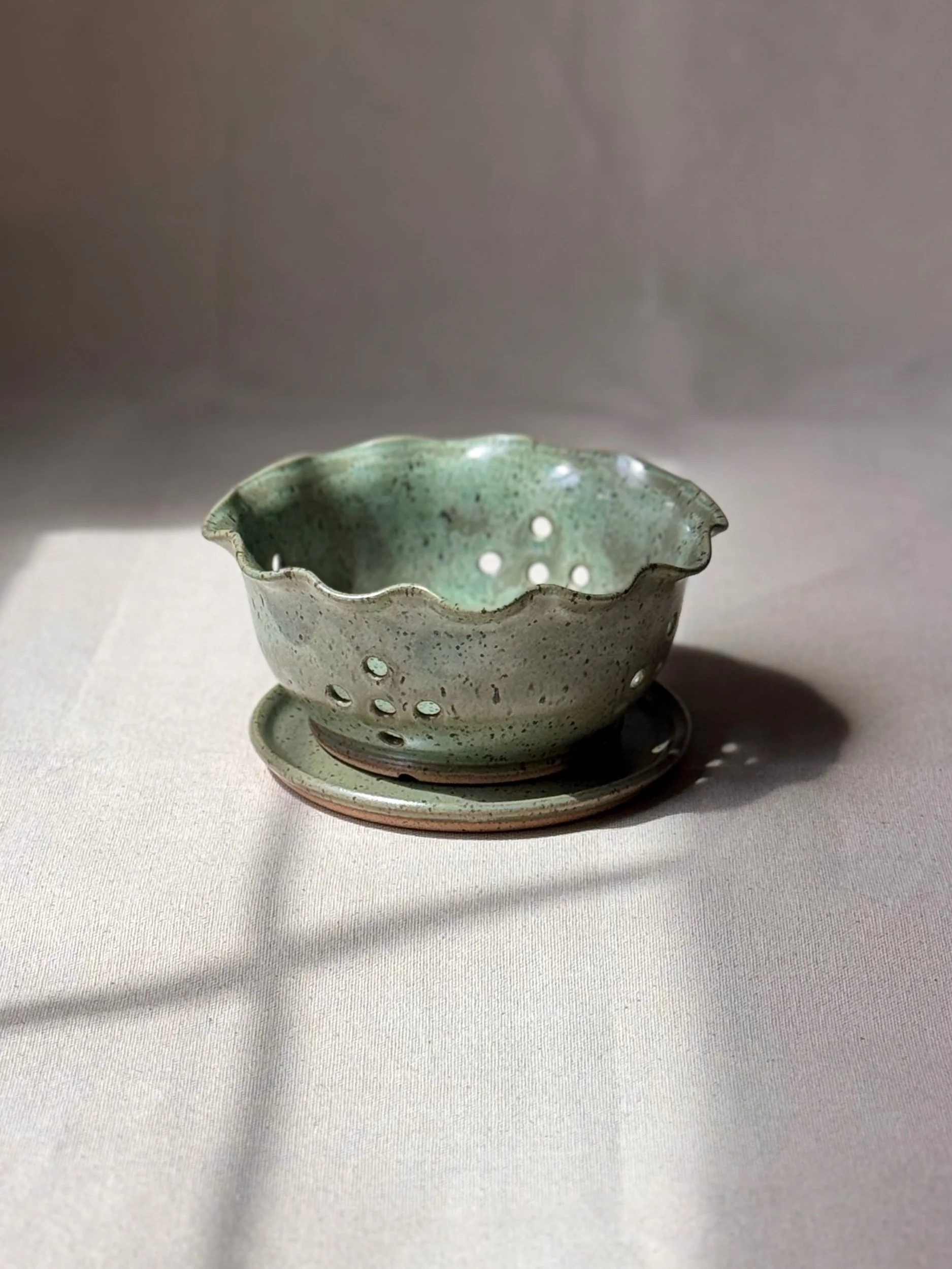 Note: This handmade berry bowl is made for rinsing and serving with ease. Paired with a matching saucer to catch excess water after rinsing, it moves easily from sink to table or into the fridge for later. Each piece is hand-punched with drainage holes and finished with a softly ruffled rim. The footed base includes subtle side channels for added drainage. Sized for a pint of berries or small servings of produce.