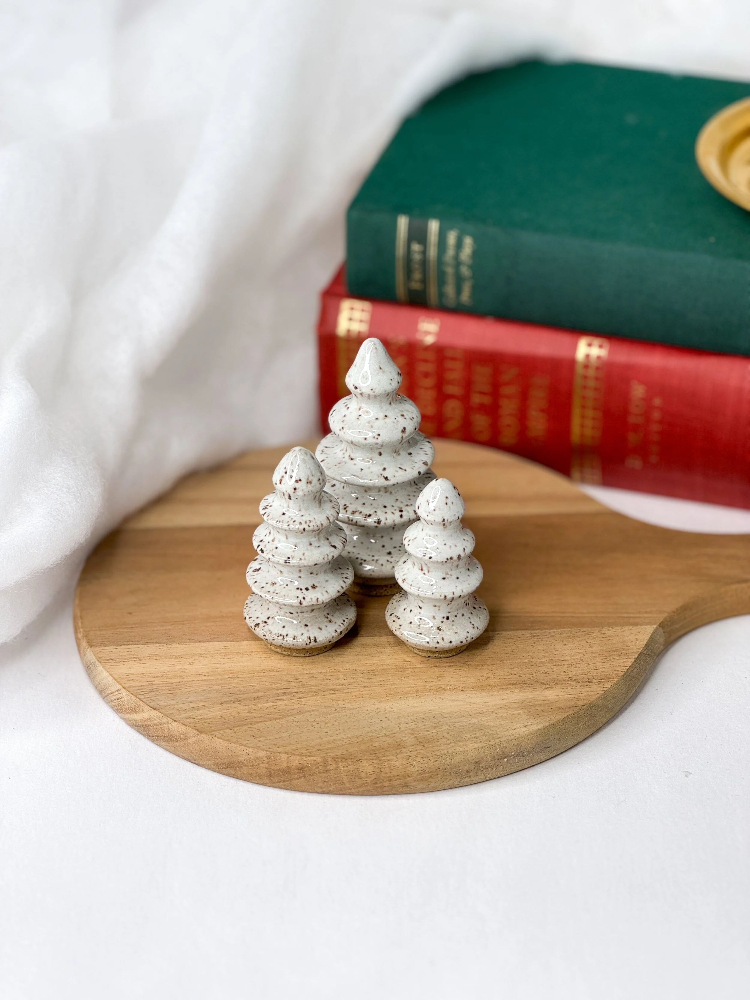 Note: This set of three holiday trees is just right for gifting or adding a touch of cheer to small spaces. Available in green or white, they come in a simple gift box with a velvet bow, ready for gifting. Perfect on a charcuterie board, tucked onto a bookshelf, or sprinkled throughout your holiday decor.
